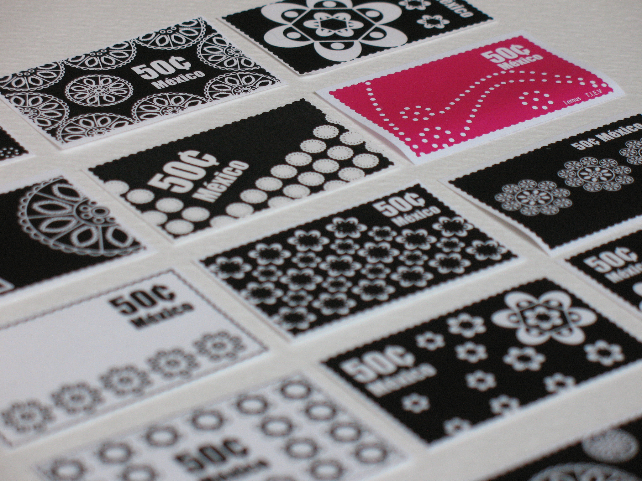 Diseño de timbres postales conmemorativos. Con el tema de La hojalata Mexicana se crearon una serie de timbres postales monocromáticos para conmemorar dicho tema.