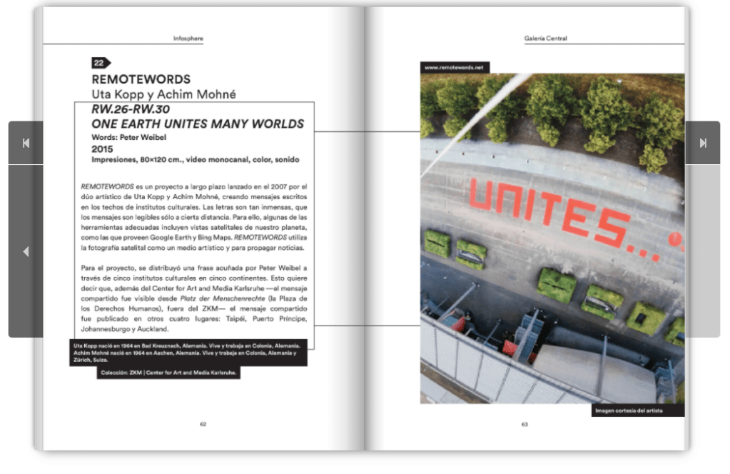 Los temas de esta muestra van desde la visualización de ondas electromagnéticas, la geología de los medios y la materialidad de sus infraestructuras, hasta el fenómeno cultural de la digitalización; de igual manera, nivelan un análisis artístico de algoritmos, soberanía de datos, redes sociales y big data. Las obras que se exhiben presentan soluciones que artistas, diseñadores y arquitectos han encontrado en respuesta a los retos graves que presenta la infosfera.