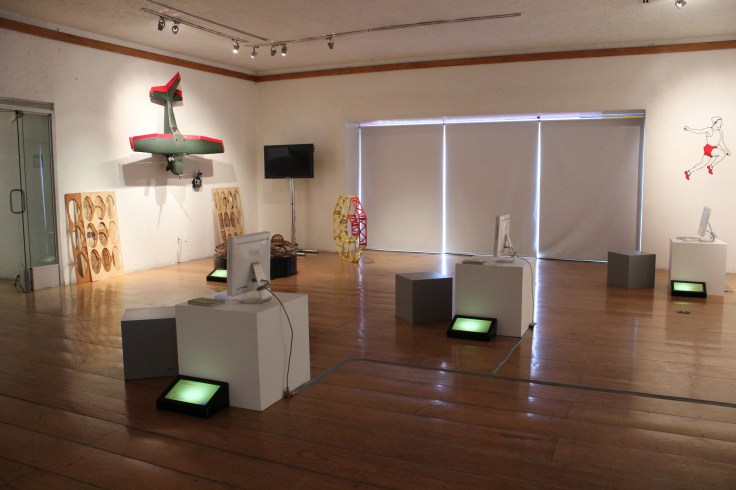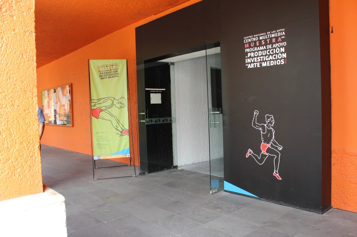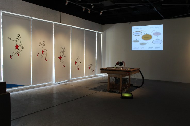 Utilizamos los motivos gráficos que en este caso era el stop motion de un atleta de salto de longitud (haciendo referencia a que el PAPIAM, es un proceso, un salto, un avance significativo en la carrera de cualquier artista mexicano que esté involucrado en el Arte Electrónico) en donde visualmente se podía identificar que los atletas tenían zapatillas y shorts rojos. Cabe mencionar que el vinil que se utilizó en esa ocasión es recorte de vinil lo que implicaba que se tenía que colocar cada uno de los atletas con sus aditamentos en color rojo, en la pared principal colocamos la secuencia de salto hasta llegar al texto principal de sala.