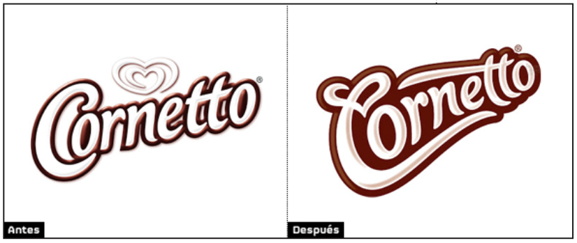 observamos los ajustes que le realizaron a la marca y efectivamente observamos que el retoque alejo a la marca de la manufactura manual, a manera de infografía Cornetto explica la construcción por un lado de la marca y por el otro del producto, habla de evitar el consumo de chocolates y por lo tanto aumentar el consumo de Cornetto, la construcción del lettering va acompañada por la construcción de un adherente mas y es que la palabra Cornetto está dispuesta con la misa forma que un cono de helado.